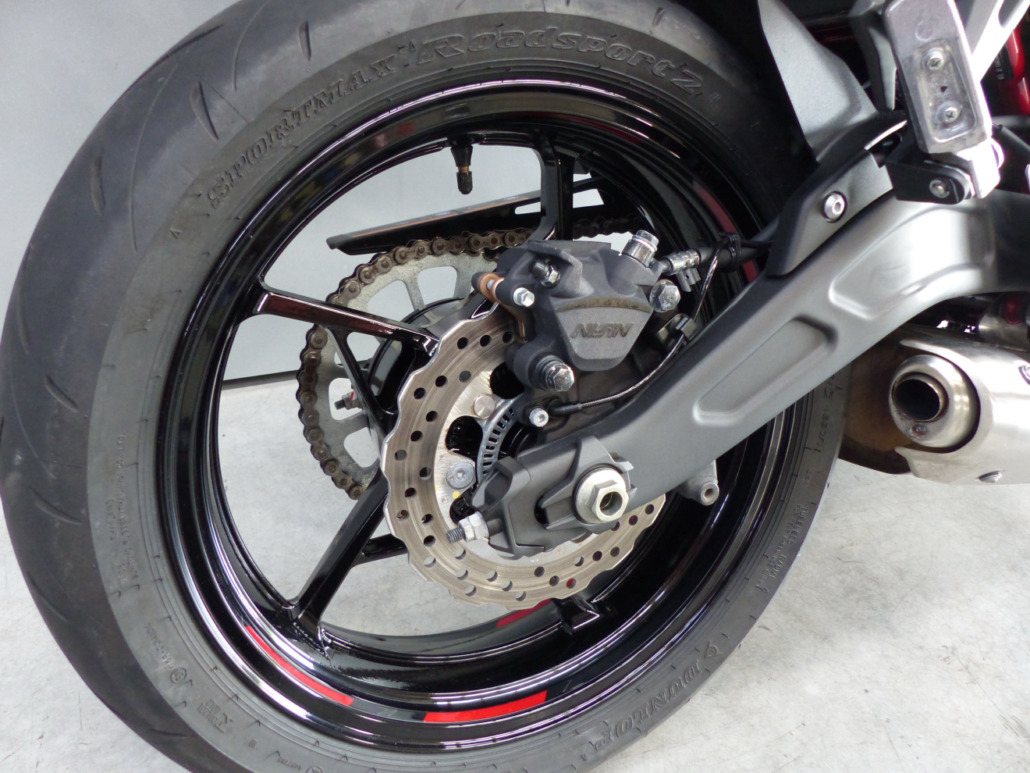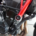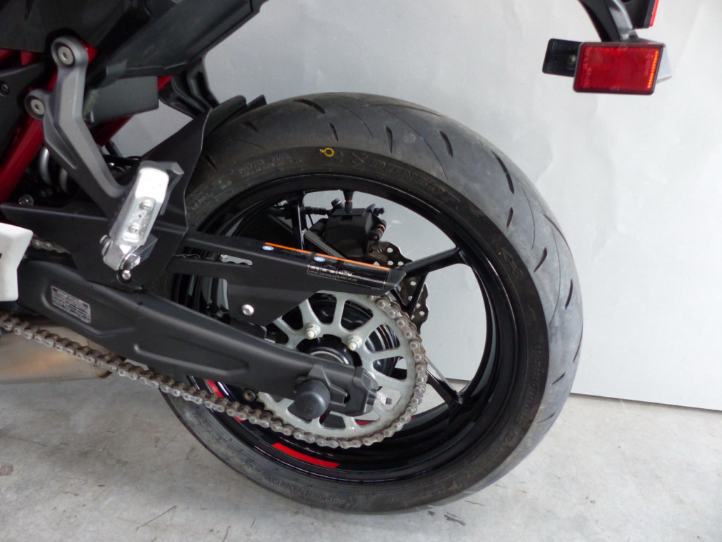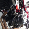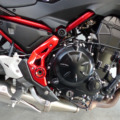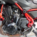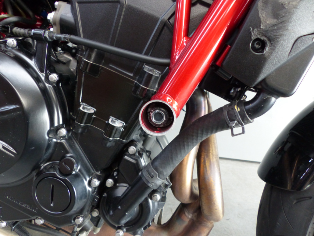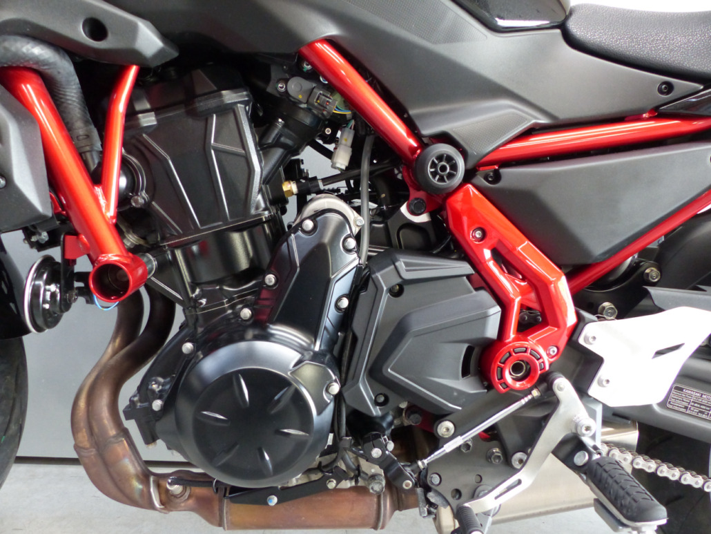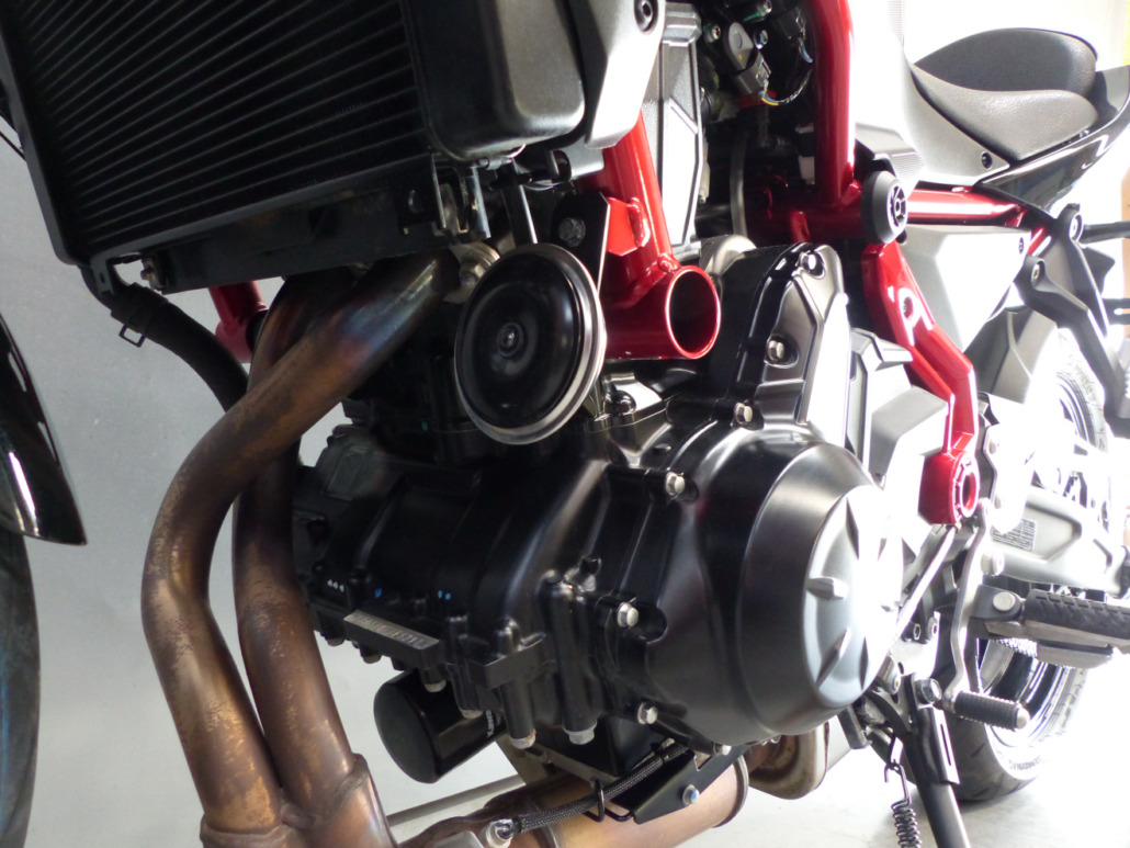 Retouche de peinture sur la cadre, le bas de fourche droit et le carter d’embrayage.